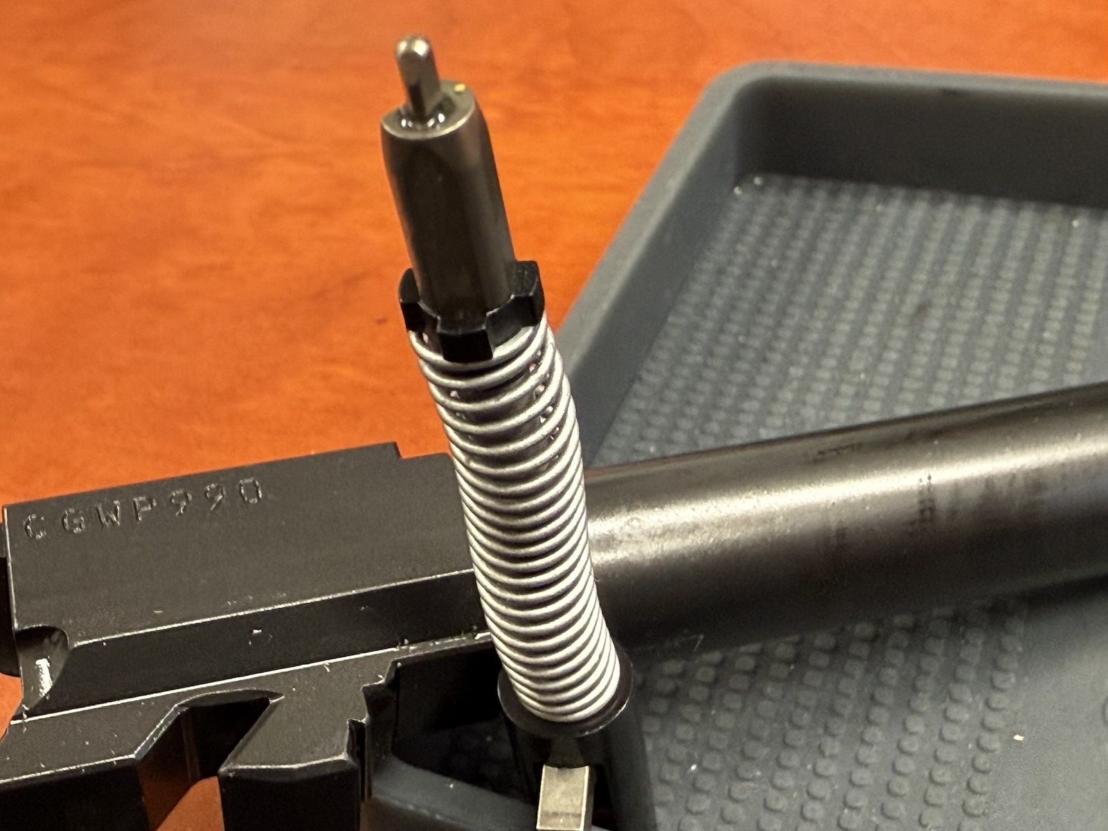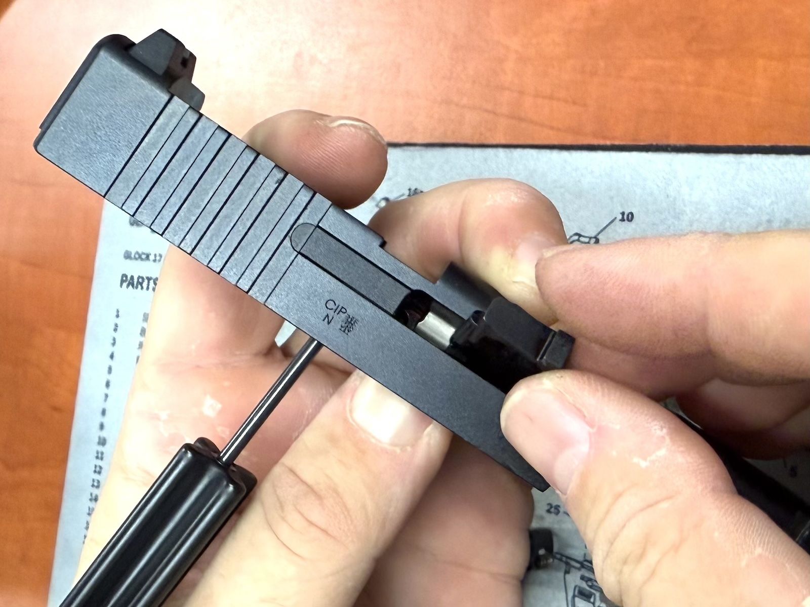 - Demontáž/montáž vytahovače se provádí pomocí rozborné tyčky Glock, která se zasune do otvoru v závěru pro zablokování pružiny vytahovače.