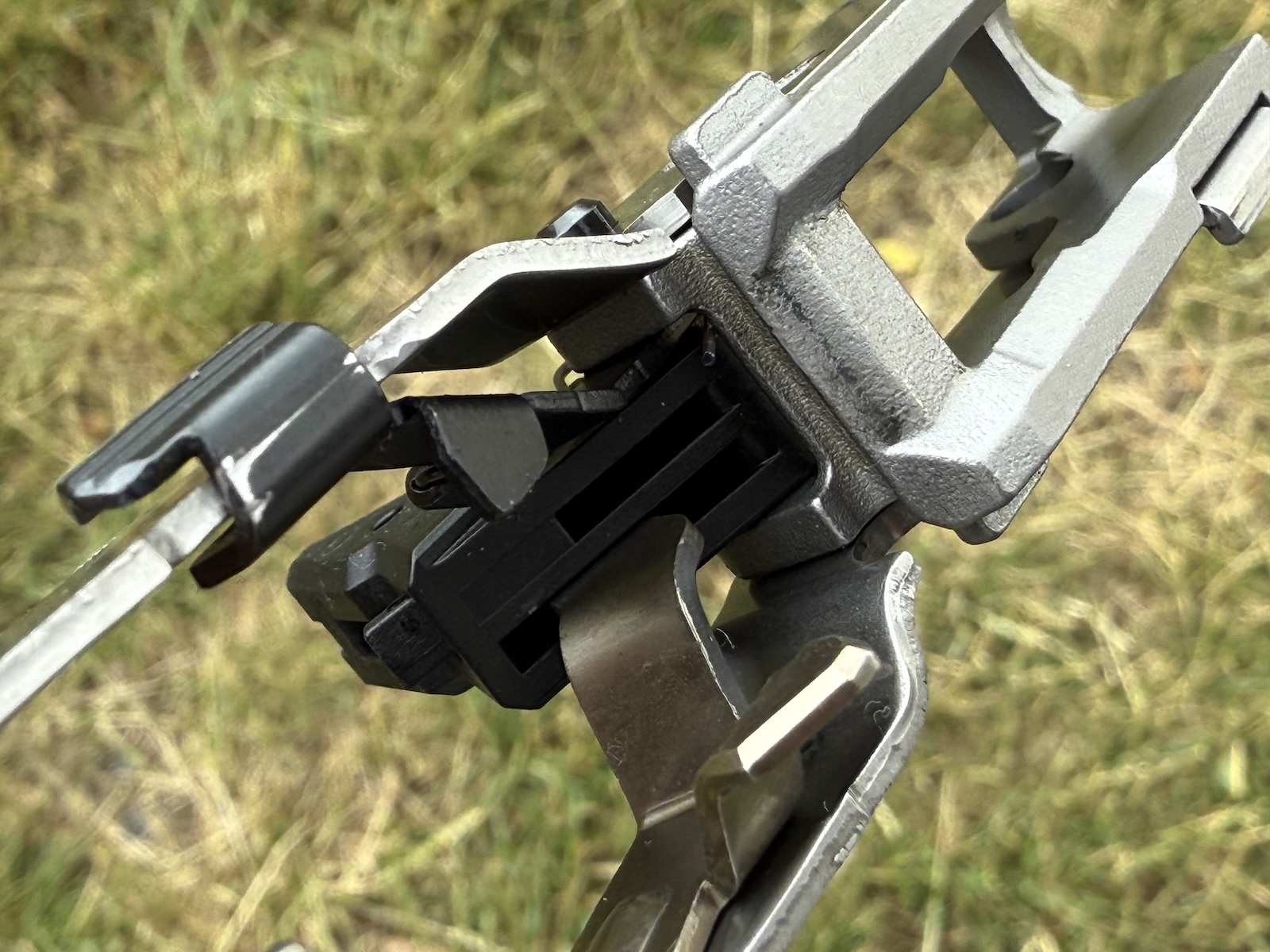 - Zajímavě řešený je (plastový) záchyt zásobníku. Je relativně malý plochou - má obdélníkový průřez s drážkovaným hmatníkem - ale poměrně vysoký, usazený ve výrazném zahloubení v kořeni lučíku.
