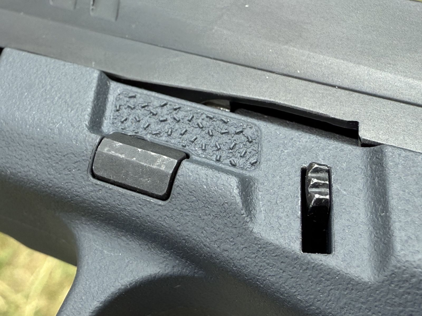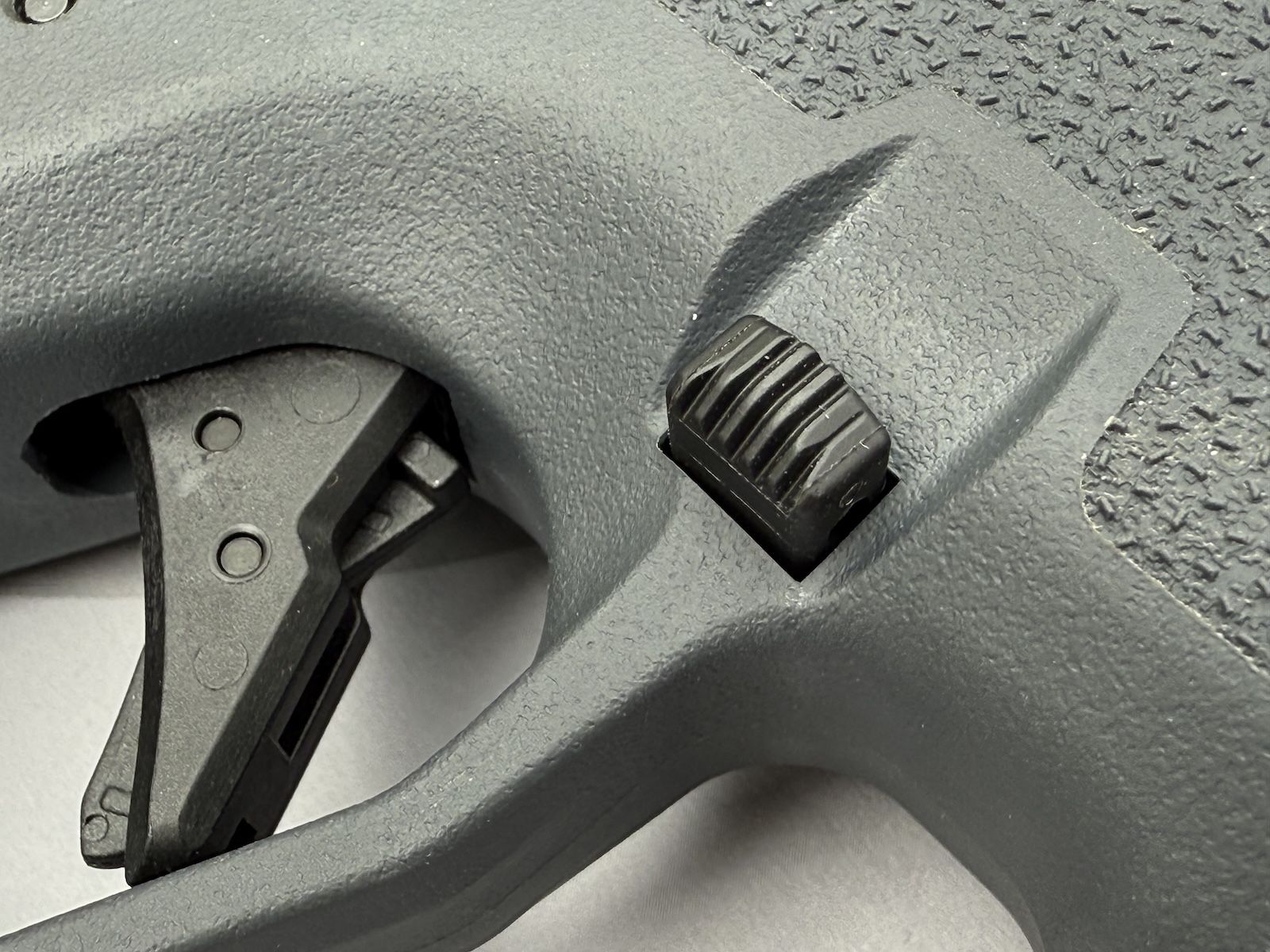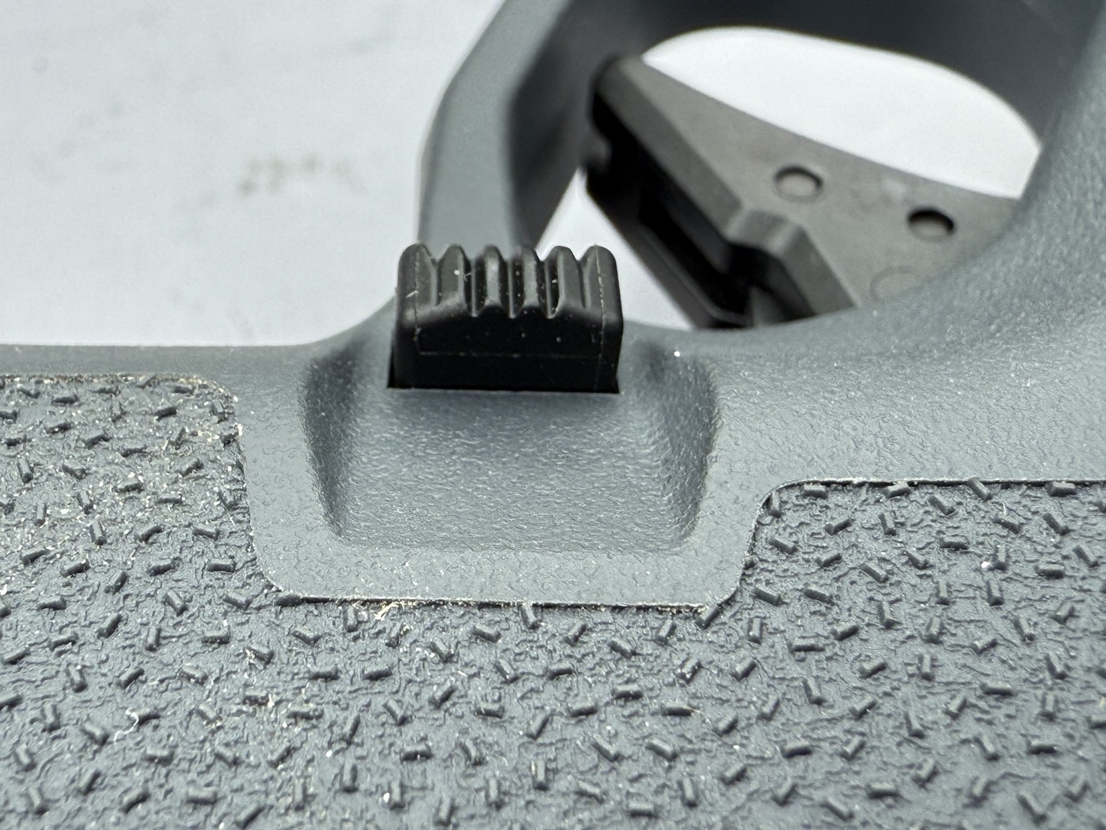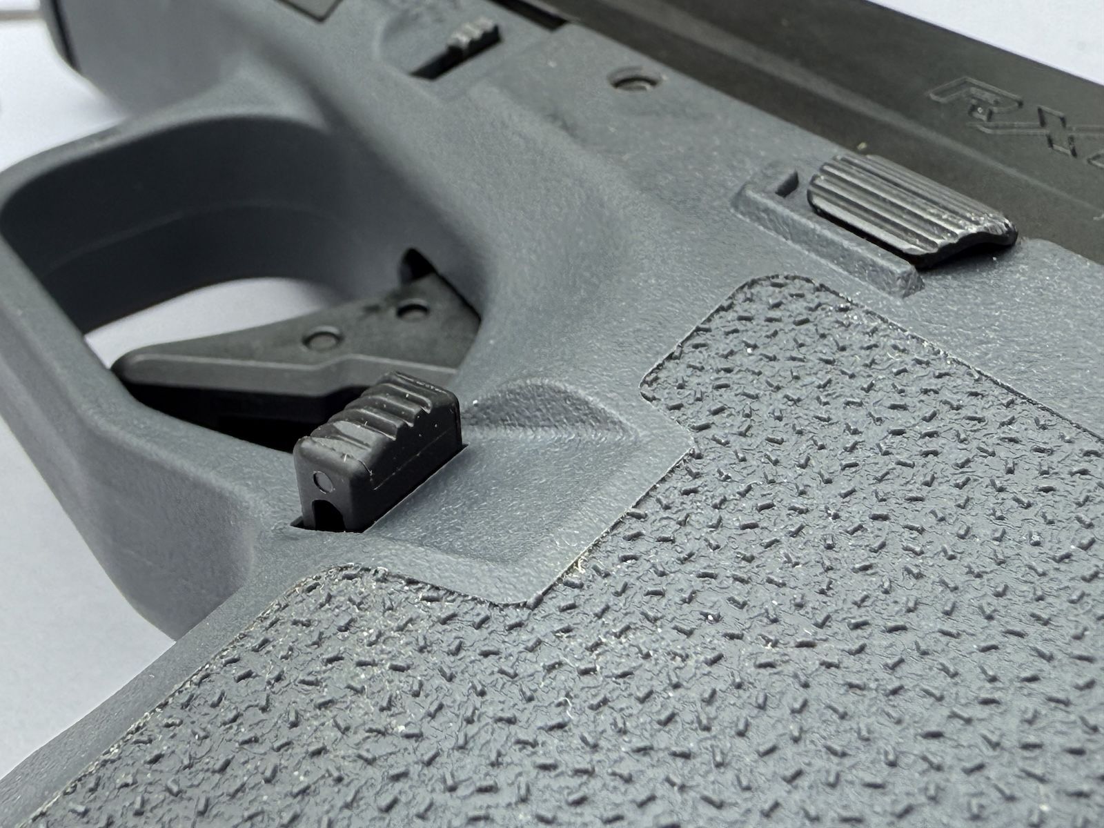 - Záchyt závěru je kovový a tvarem hmatníku mírně odlišný od originálu (pokud tak budeme nazývat G19 Gen3). Není plochý, ale v polovině prohnutý, takže tvoří výraznější oporu pro ovládání, ale zároveň nevyčnívá z bočního profilu zbraně.