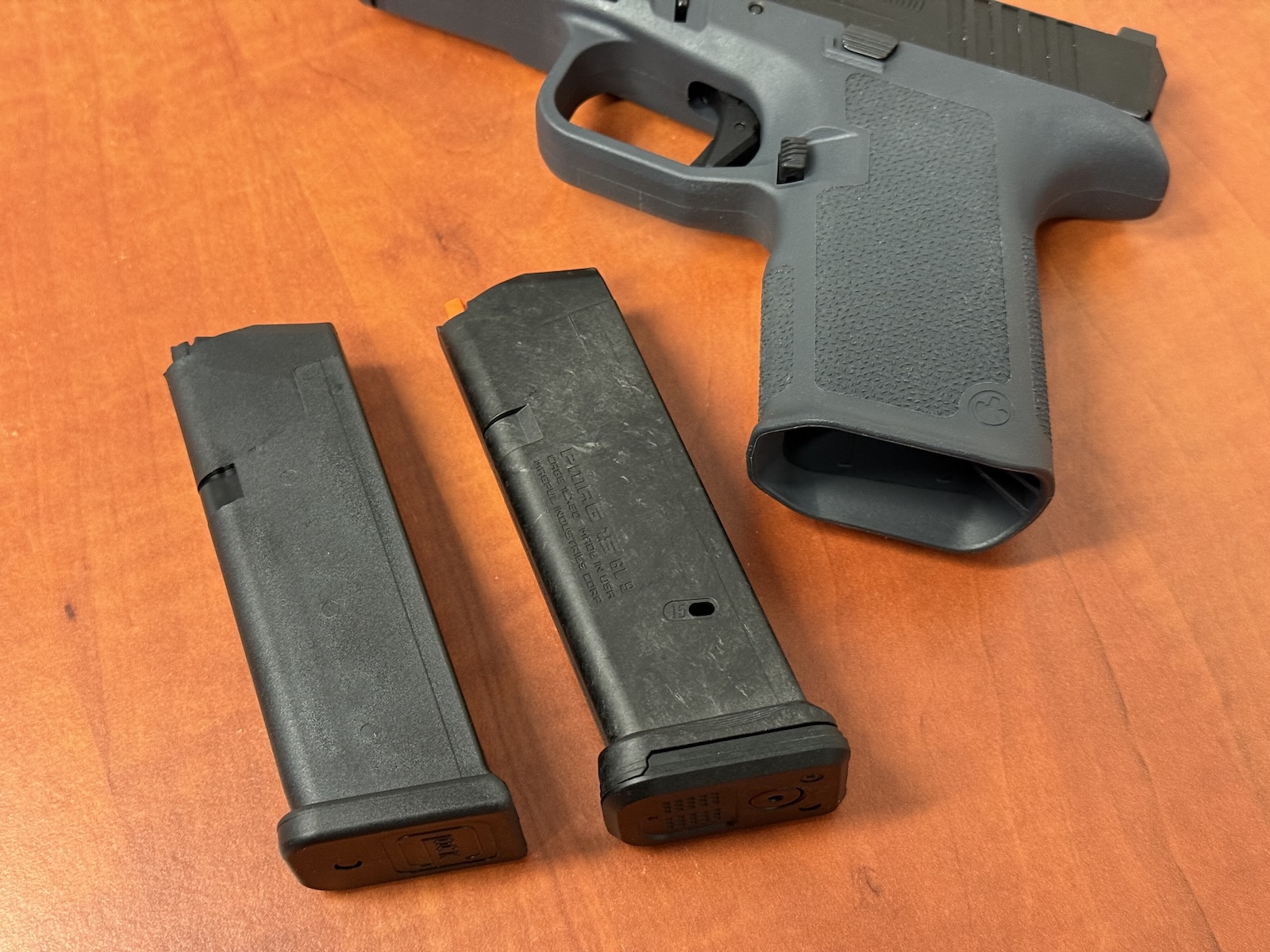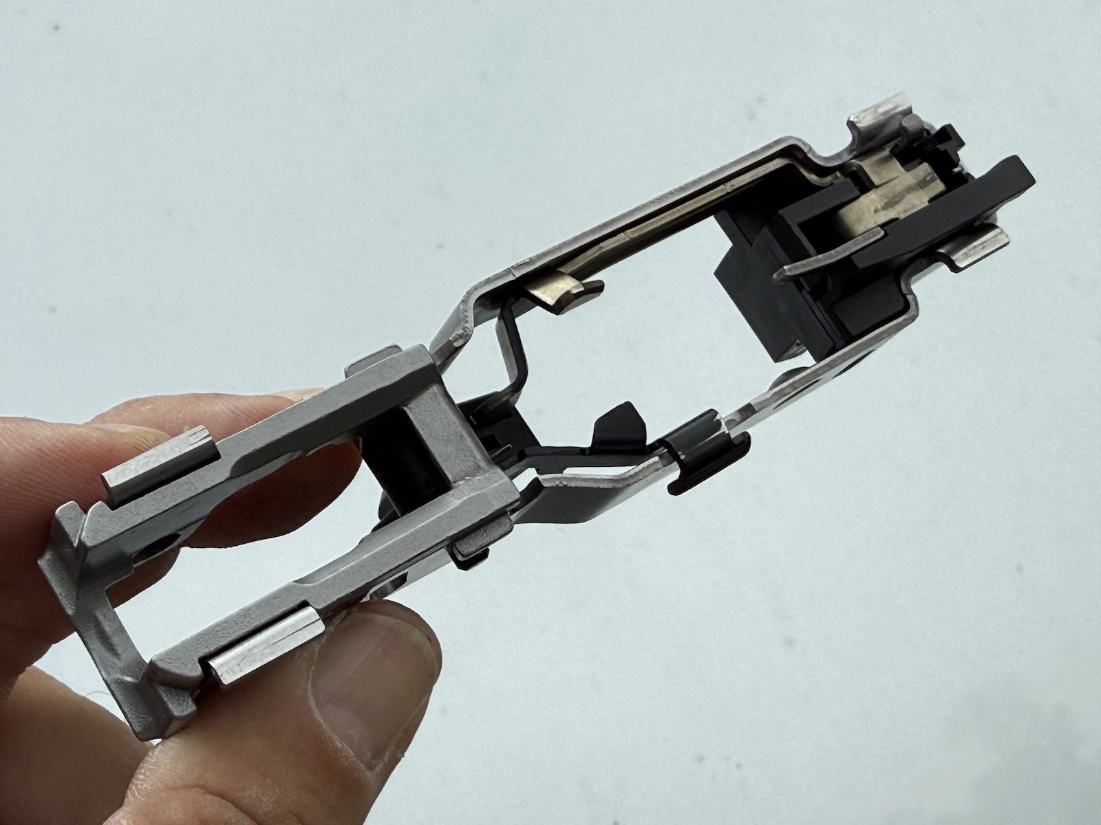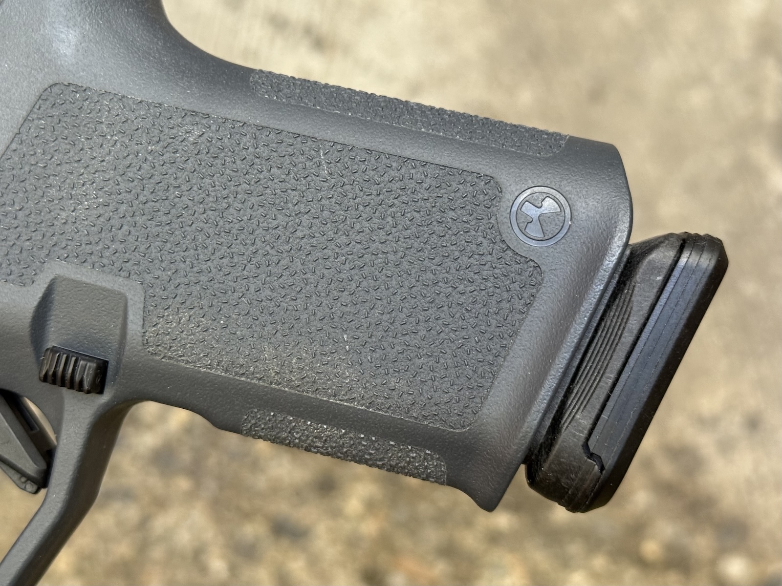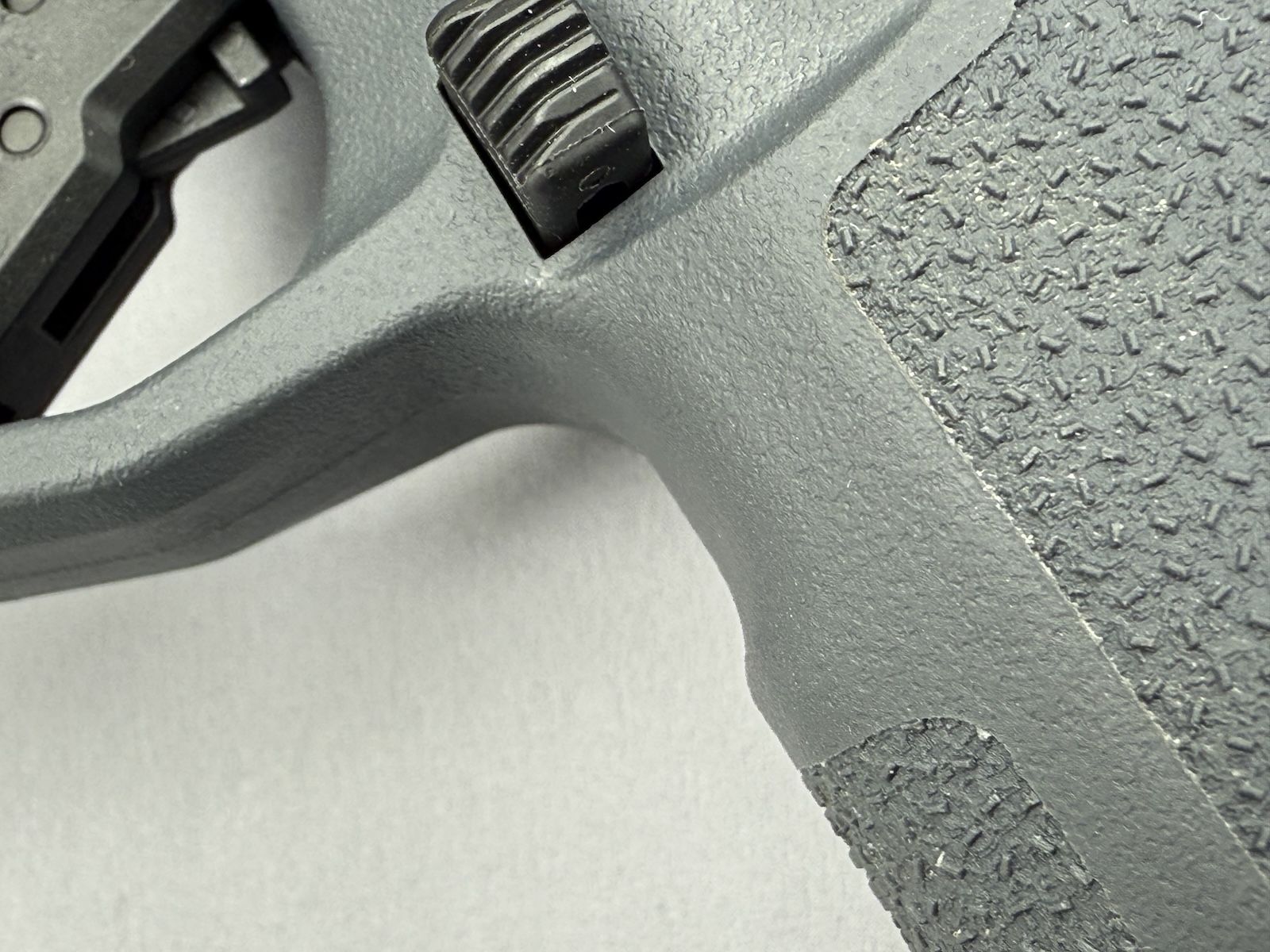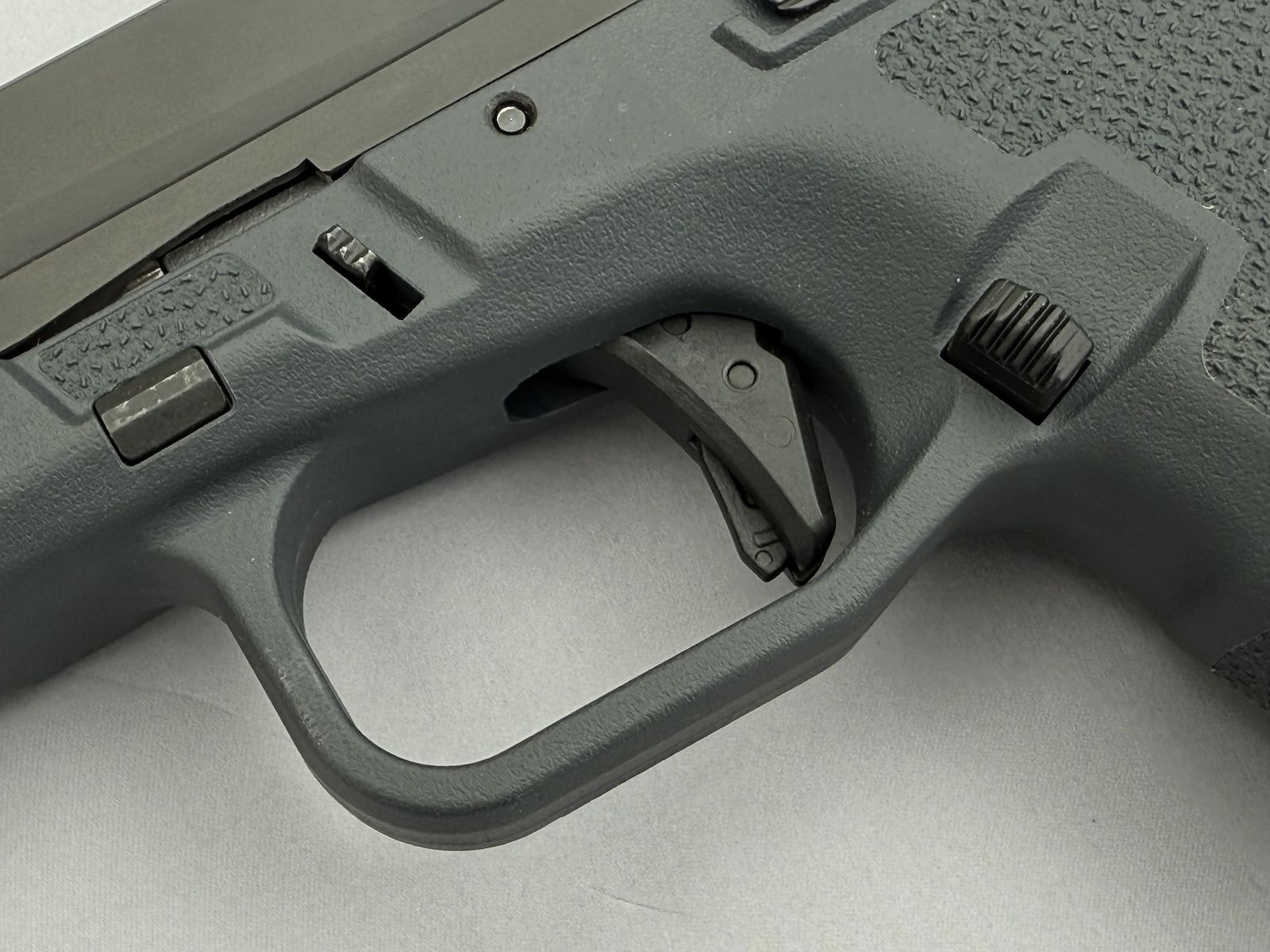 - Záchyt závěru je kovový a tvarem hmatníku mírně odlišný od originálu (pokud tak budeme nazývat G19 Gen3). Není plochý, ale v polovině prohnutý, takže tvoří výraznější oporu pro ovládání, ale zároveň nevyčnívá z bočního profilu zbraně.