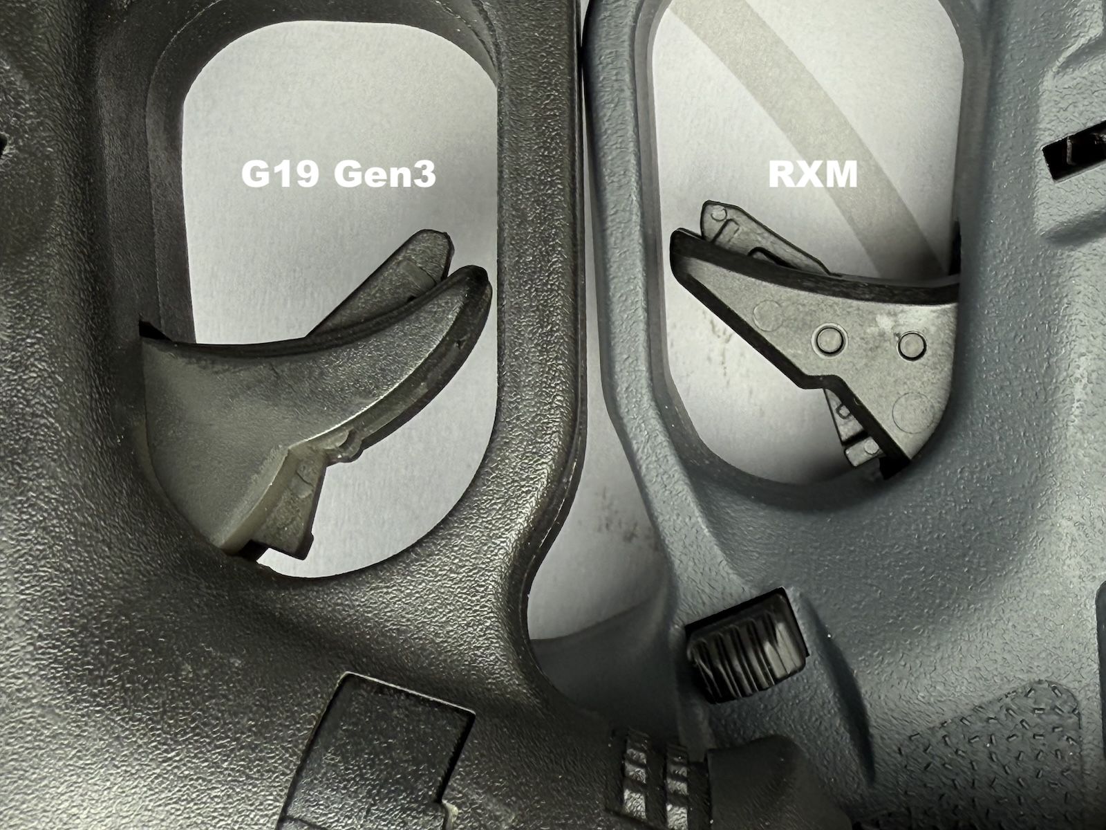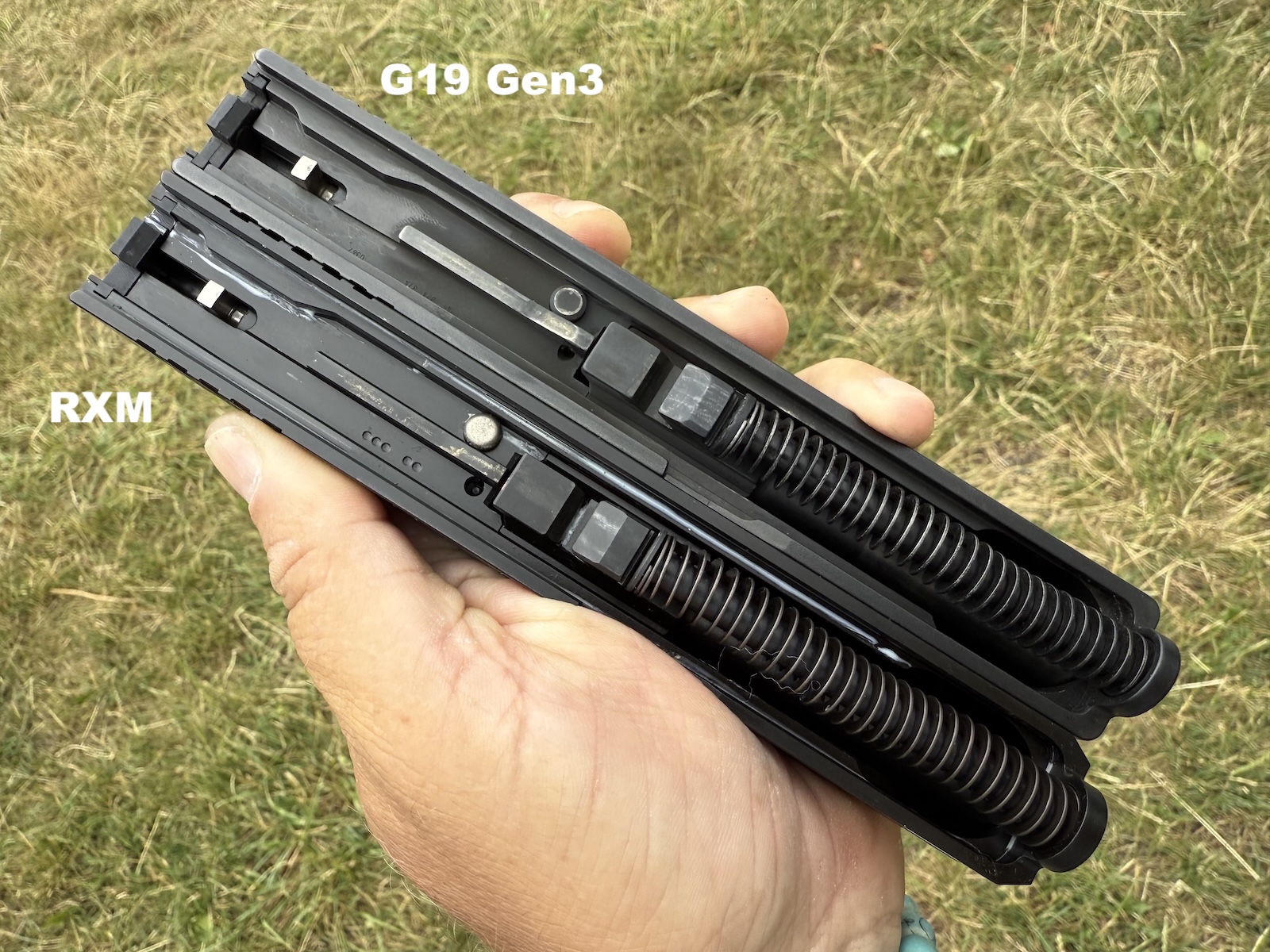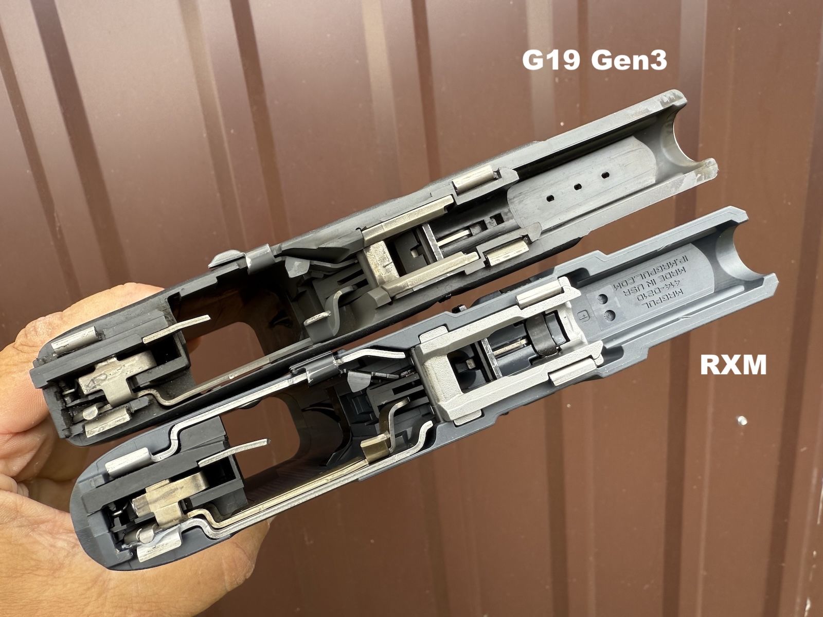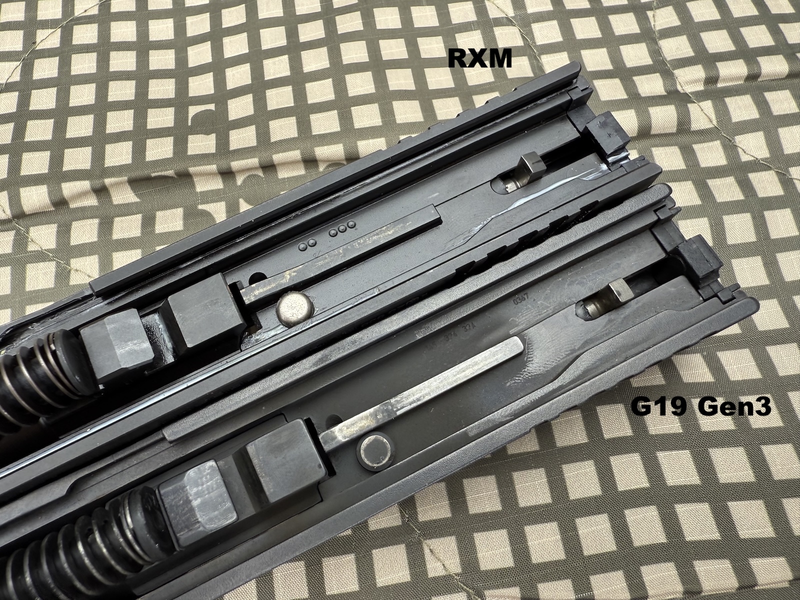 - Mezi RXM a G19 Gen3 je vysoká zaměnitelnost dílů resp. je možnost použití dílů Glock v RXM, některé konkrétní rozdílné detaily najdeme. Například standardní vratná pružina Glock Gen3 má celoplastové vodítko, u RXM je jeho konec (tam, kde se opírá o hlaveň) kovový.